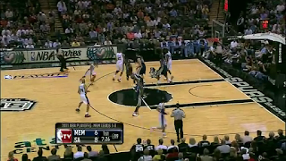 This is kind of a broken play based on a tricky no-call . Tony Allen penetrates and pretty directly charges at Manu, but McDyess is streaking into the charge himself and all three tumble to the ground. While they're all falling to the ground (completely blocking the Spurs path to the open Sam Young on the left wing), Allen smartly kicks it out to Young, who drains a long two. Weird play.